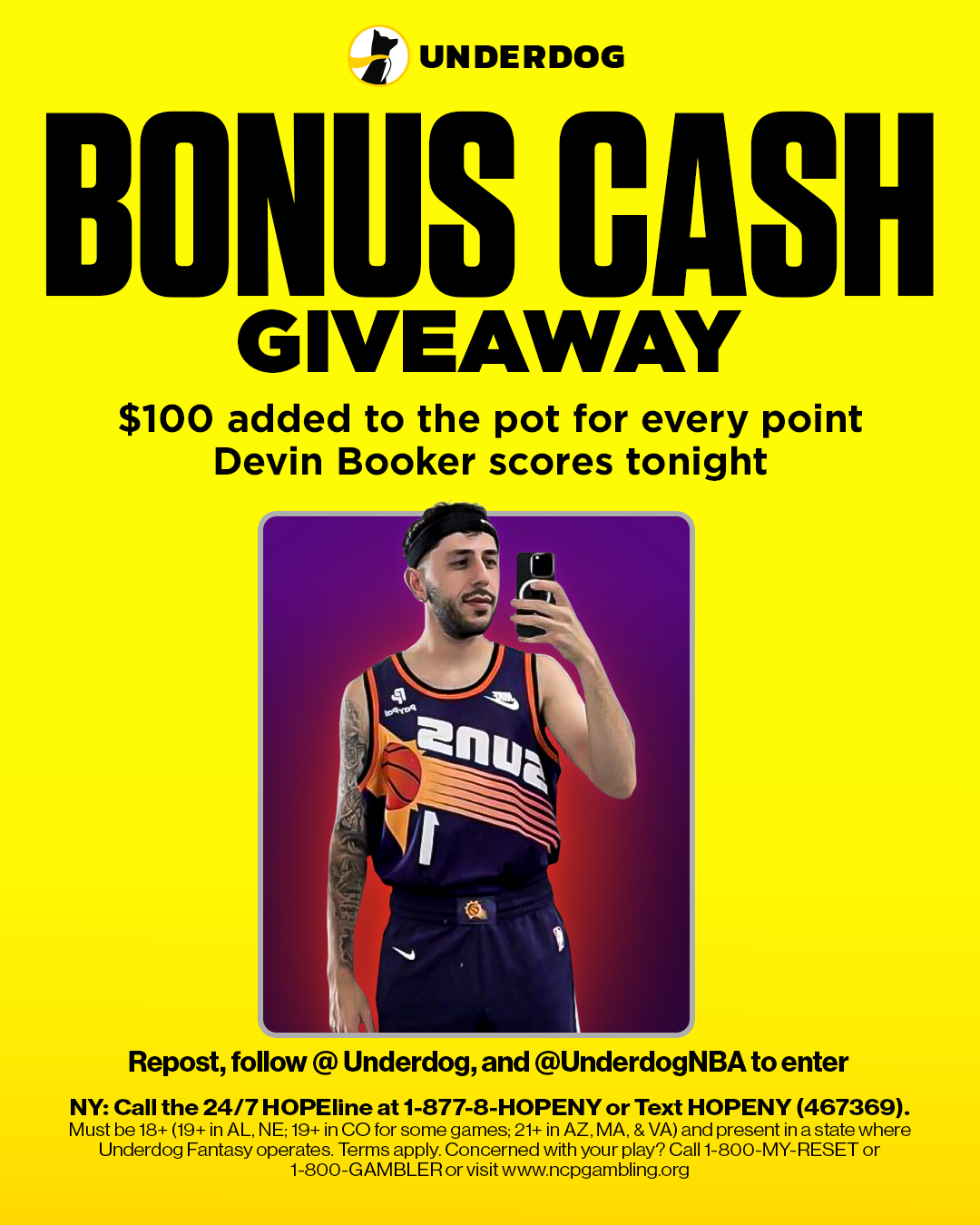 Welcome to the Underdog Devin Booker Points Giveaway (“Giveaway”). Following the NBA playoff game between the Phoenix Suns and Oklahoma City Thunder on Monday, April 27th, 2026, Underdog will award ten (10) eligible participants a share of a prize pool of bonus funds equal to one hundred dollars ($100) multiplied by the total number of points scored by Devin Booker during that game (“Giveaway Reward” or “Prize”). The prize pool will be divided equally among the ten (10) winners, subject to a maximum aggregate prize pool of five thousand dollars ($5,000) of Underdog Bonus Funds (i.e., giveaway capped at fifty (50) points). Each winner’s share will be awarded as bonus funds directly to their Underdog account.