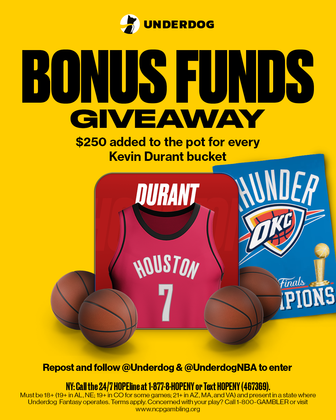 Underdog will award one customer $250.00 in bonus credits for every Kevin Durant field goal made in the game between the Houston Rockets and Oklahoma City Thunder on Tuesday, October 21, 2025. Winners will be selected at random and will receive $250.00 in Underdog Fantasy bonus credit deposited to their Underdog account.