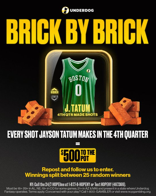 Twenty-five (25) winners will be awarded Underdog Bonus Funds, determined by the number of field goals made Jayson Tatum totals in the 4th Quarter in his game against the New York Knicks on Saturday, May 10, 2025. Underdog will add $500 to the total for every field goal made, up to 10 made field goals. Winners will be selected at random and will receive an equal split of bonus funds.