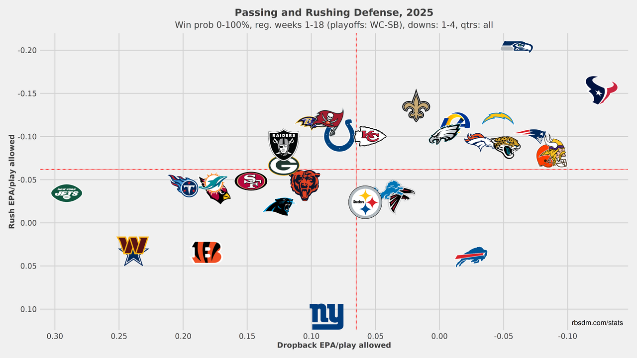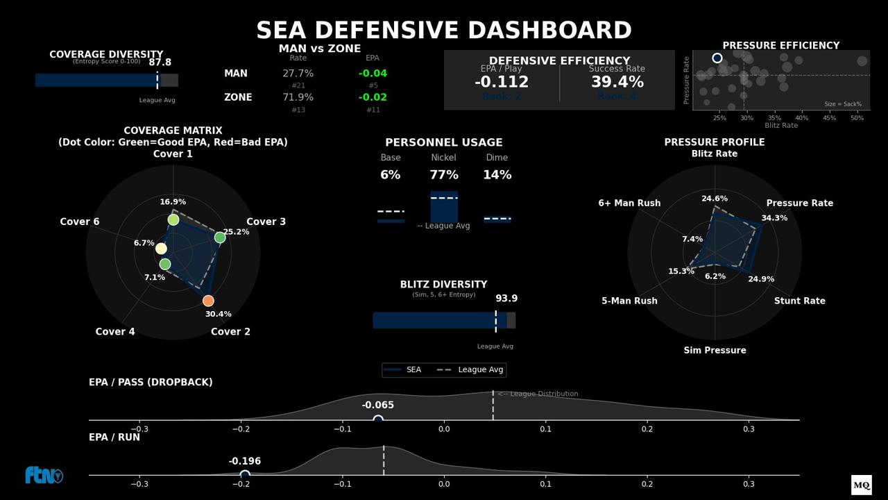 As the dashboard above shows, the Hawks' coverages are so hard to identify at times that the charting services (PFF vs. FTN) are way off in their coverage splits, particularly when it comes to Cover 2, Cover 6, and quarters. Either way, this dashboard shows Seattle doesn't blitz often, rather using lots of stunts across their 4-man front while using these blended zone defenses in the secondary to create confusion. That's why Mike MacDonald is the face of the modern NFL defense today. They have an above-average 34% pressure rate on the whole.
