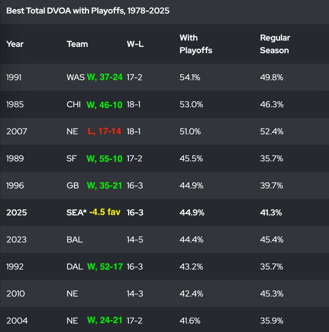 I like the Seahawks' point spread at 4.5, too. Once accounting for the Seahawks' 7th-toughest strength of schedule versus the Patriots' No. 32 schedule (3rd easiest since 1978), the Seahawks are a meaningfully better team. They've beat the Rams and 49ers twice in the last month and a half, while the Patriots have put up -0.13 EPA per offensive play in the playoffs against the Chargers, Texans, and Broncos. Both coaching staffs and special teams are great, but the depth of roster leans Seattle. They have slightly better weapons headlined by Jaxon Smith-Njigba, while having more above-average starters in the back seven and at edge rusher. To put all of this together, let's put the Seahawks season into perspective by using DVOA, which is a stat that is era adjusted and compares teams to the league average adjusting for strength of schedule....