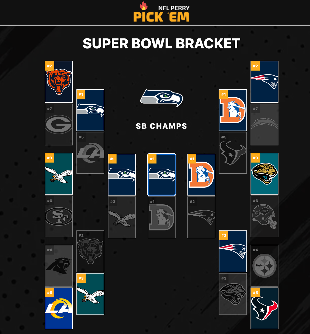 This bracket is courtesy of NFLPerry, but this would be my most likely outcome with the Seahawks winning, 21-17, in a low-scoring Super Bowl. That'd summarize a very balanced and low-scoring 2025 regular season where a team without an elite QB can win it all if they have the right coaching staff, defense, and skill group.