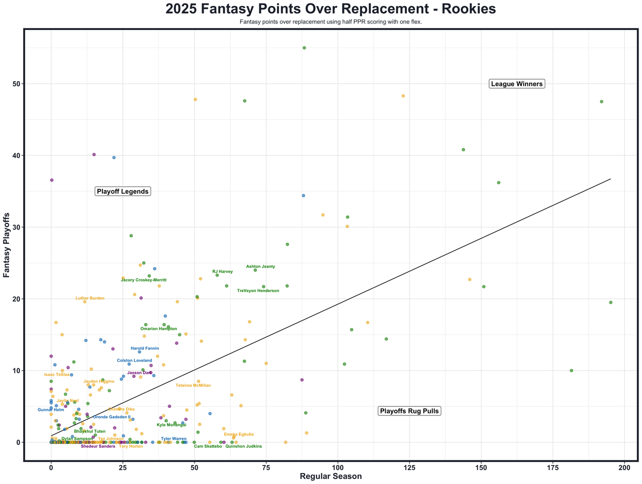 Best Rookie Pick: Cam Skattebo. This is more about the process than the entire season of fantasy points added. Skattebo wasn't playable in Week 1, broke out in Week 2, and then had 6-straight top-24 RB weeks once he was in everyone's lineups. That included an RB3, RB6, and RB11 finish, too. The Giants were an offense that you wanted in fantasy because Jaxson Dart was an upside rookie and the OL was underrated, and if he would've stayed healthy, it's hard to believe he wouldn't have been a top-15 RB on the year as the 110th overall pick who was drafted after Tyrone Tracy himself. On top of that, every Skattebo fantasy point created more dopamine than the average fantasy point.