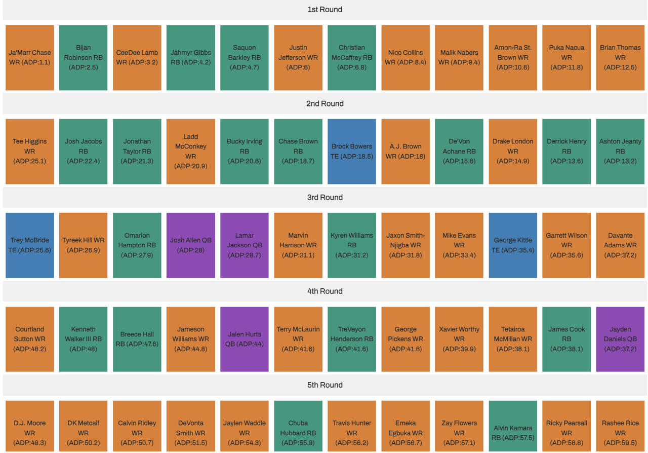 Early QBs busted. This one was largely due to injuries, but those injuries did happen to the more injury-prone QBs like Jayden Daniels, Lamar Jackson, Joe Burrow, and Kyler Murray. Even if they had their normal seasons, however, the emergence of a strong Statue QB Class would've made them -EV selections still. Drake Maye, Dak Prescott, Trevor Lawrence, and Matthew Stafford had great coaching and some offseason acquisitions to help them close the gap from Elite QB1s to the Great QB1s. Josh Allen absolutely deserves a Round 3 ADP again, but the gap between everyone else should be closed and likely be littered in Rounds 4-8 next year.