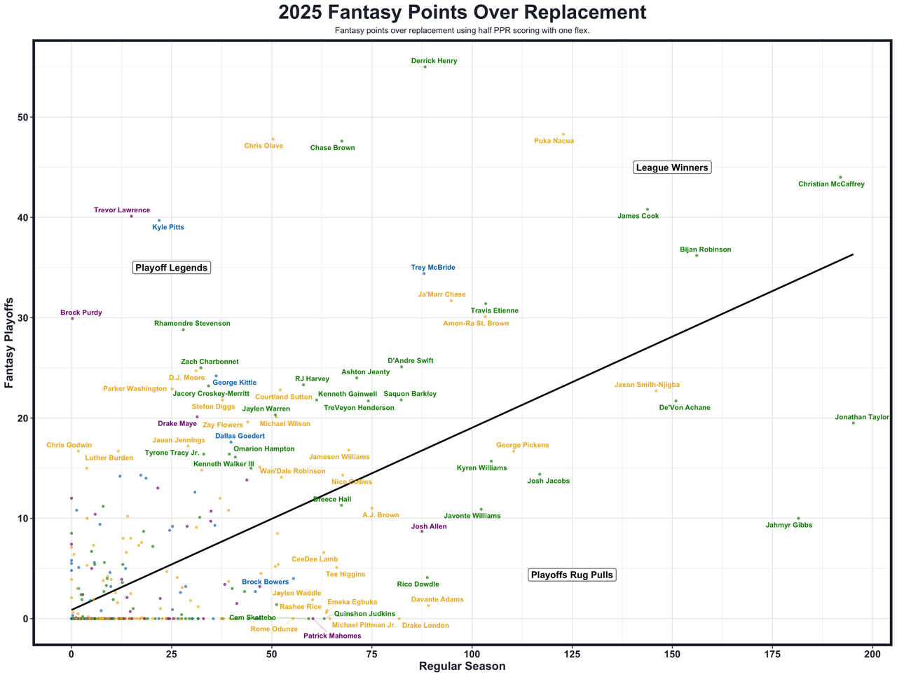 A "WR Dead Zone" emerges in Rounds 7-13. After 1st-round rookie WR Emeka Egbuka, there was a stretch in this range where only 2 receivers (Pittman, Doubs) out of 23 added more than 35 fantasy points over replacement across the entire season. The player archetype largely includes the worst team WR2s in the NFL and then 2nd-round rookies without a clear-and-obvious path to playing time. Is that surprising that they aren't as valuable as low-end fantasy QB1s or rookie RBs or committee RBs in some of the better offenses? It's not.