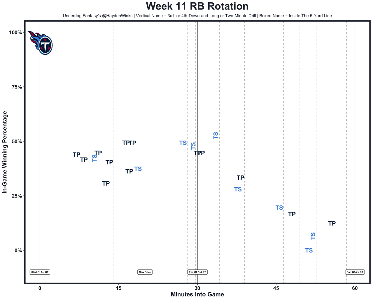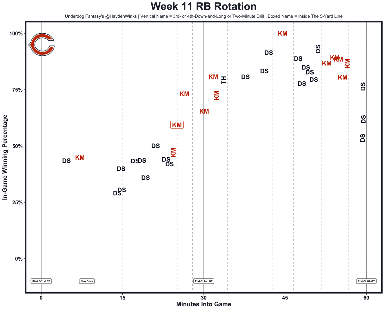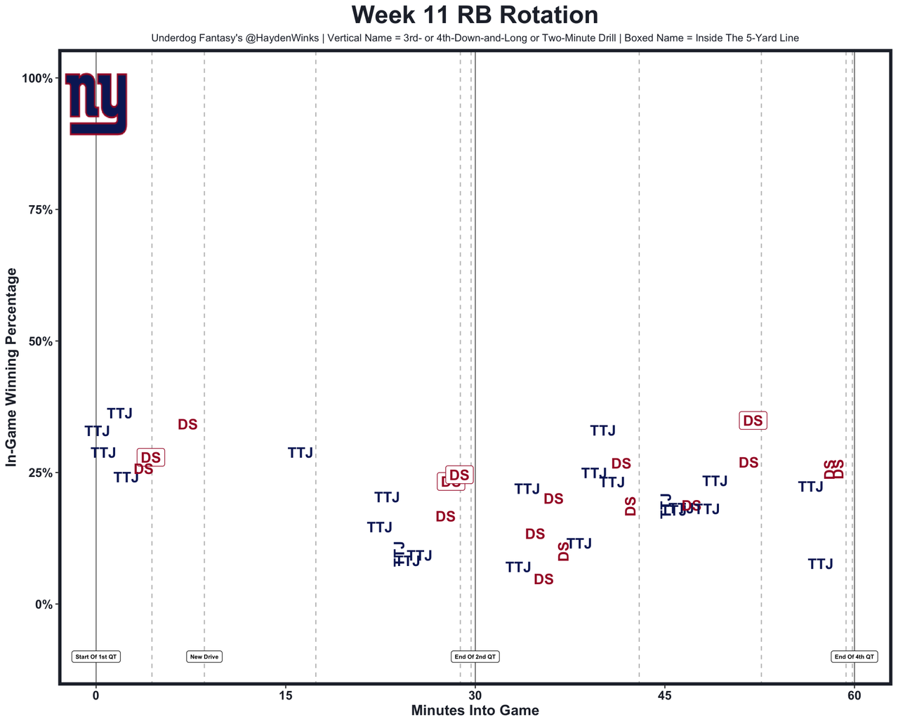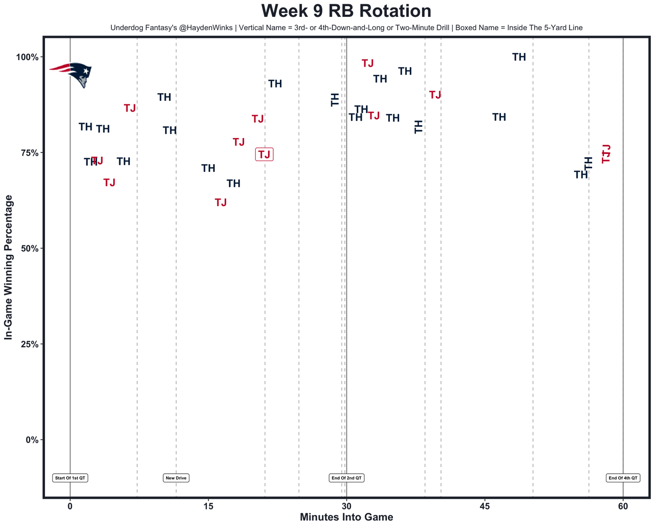 This is what the rotation was before their injuries, obviously noting that the 2nd-round pick had monster games since then. With Stevenson as the lead back in Weeks 7-8, Hendo had 0.9 and 7.4 expected half PPR points based on his usage. In Weeks 9-10 with only Jennings partly playing, Hendo had 14.7 and 12.5 expected half PPR points. Last week without either, Hendo was at 21.9 expected half PPR points. The cat is out of the bag now that they've figured out how to properly use Hendo's skillset, but Stevenson is paid well for this and next year. I think it'll be closer to the split with Jennings in Week 9 or so when both rotated. I'd still make Stevenson the slight favorite for goal-line touches, but the Patriots could also go full-blown Rookie Bump here. Nobody fully knows, so live your best life.