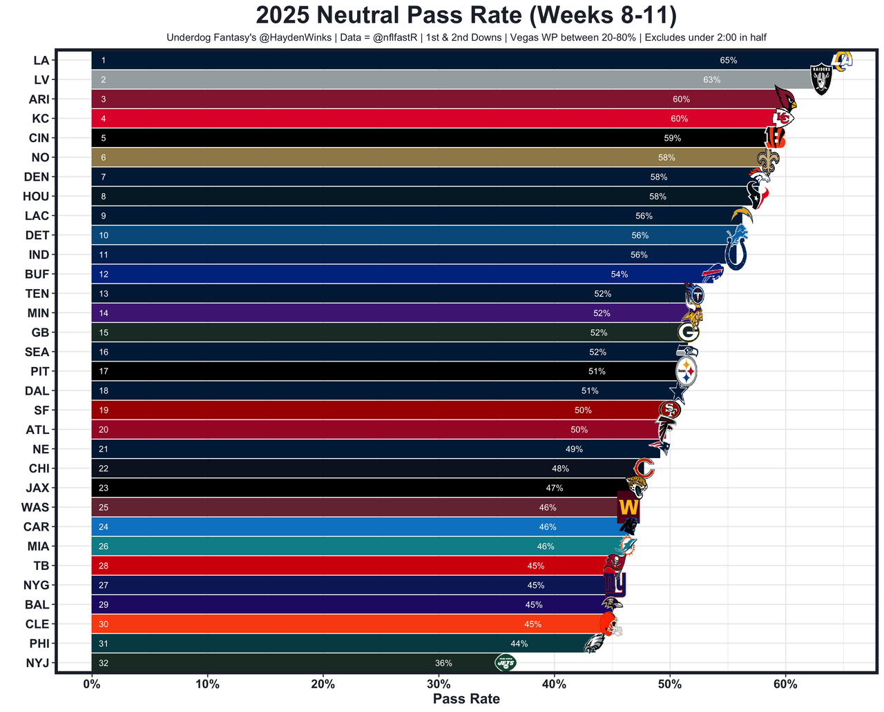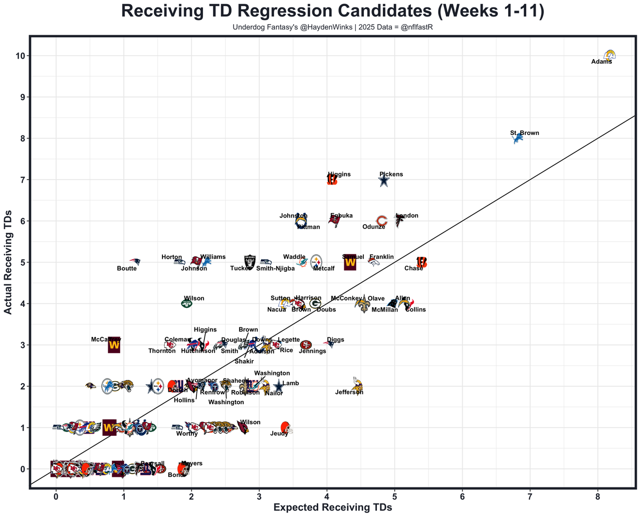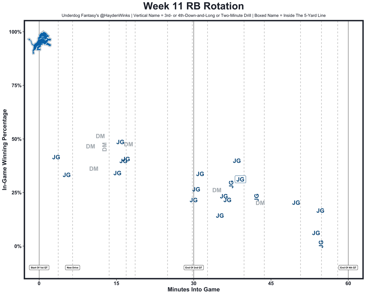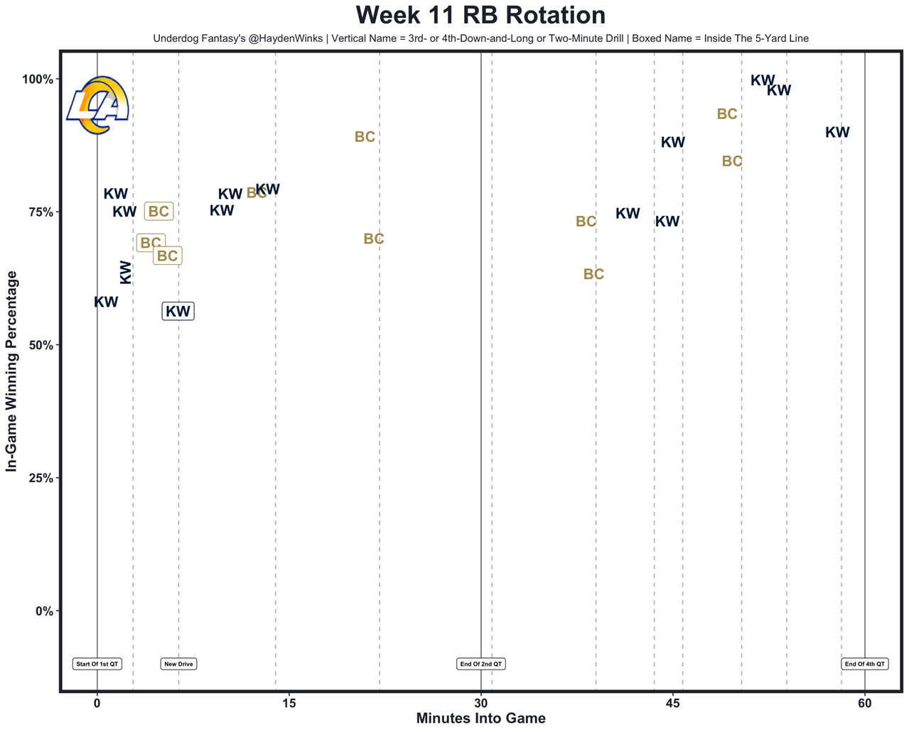 This is what the rotation was before their injuries, obviously noting that the 2nd-round pick had monster games since then. With Stevenson as the lead back in Weeks 7-8, Hendo had 0.9 and 7.4 expected half PPR points based on his usage. In Weeks 9-10 with only Jennings partly playing, Hendo had 14.7 and 12.5 expected half PPR points. Last week without either, Hendo was at 21.9 expected half PPR points. The cat is out of the bag now that they've figured out how to properly use Hendo's skillset, but Stevenson is paid well for this and next year. I think it'll be closer to the split with Jennings in Week 9 or so when both rotated. I'd still make Stevenson the slight favorite for goal-line touches, but the Patriots could also go full-blown Rookie Bump here. Nobody fully knows, so live your best life.
