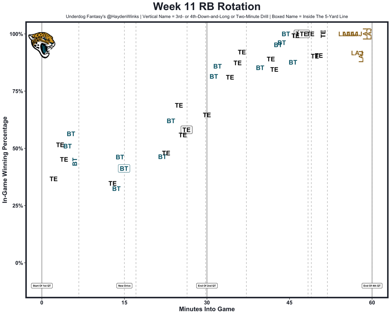 Update: Both Etienne (shoulder) and Bhayshul Tuten (ankle) were limited the entire week and then left off the final injury report. They should be back to their same rotation. Last week, that was legitimately 50/50 in snaps and touches, with Tuten having 10.1 expected half PPR points. In the two games before that, Etienne handled 70% of the expected half PPR points in the backfield as a the more clear-cut starter. Both have played fine ball. Tuten is the RB35 on RB34 usage this month.