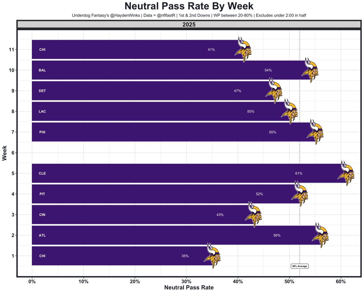 The Vikings are 4th-lowest in projected points (17.0). The two lowest neutral pass rates of the season for Minnesota have been in Week 1 and last week, two games with JJ McCarthy starting. They have to protect the kid at this point, and they do have the OL to get hot on the ground. Jones had a season-high 11.9 expected half PPR points last week, equivalent to RB22 usage. There is a path to fantasy RB production even with bad QB play here, but it is threading a needle.