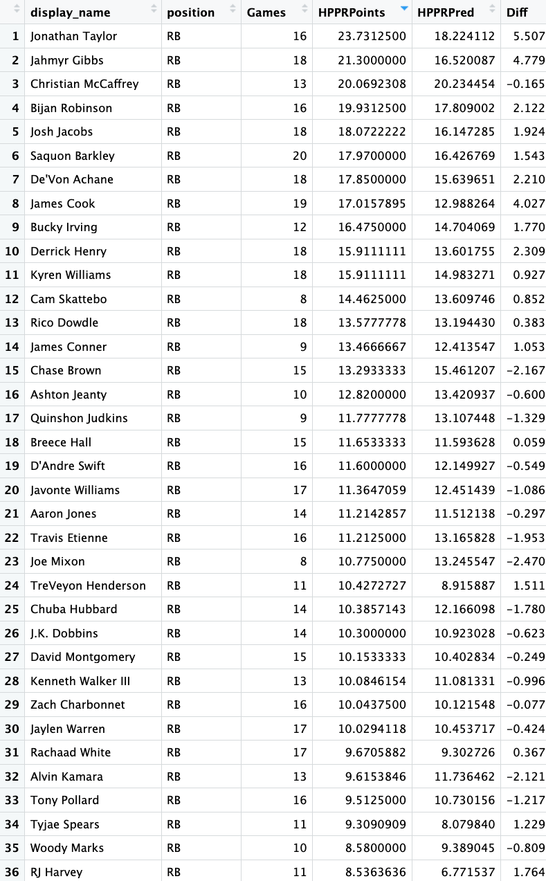 It didn't feel like it in the box score, but Dowdle had a season-high 21.7 expected half PPR points last week when the Panthers offense broke out of a big-time funk. Dowdle is still a total bellcow in a run-first offense with admirable blocking. He's produced when the Panthers have had below-average team totals like this week (20.25), and the 49ers front seven is entirely on injured reserve. It's a very clean spot here. The floor is super high with 5-straight games above 14.1 expected half PPR points as the starter.