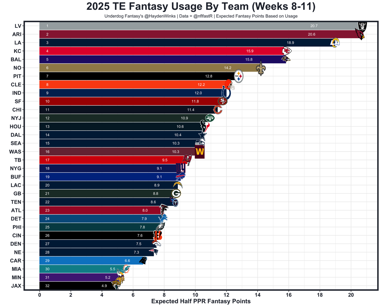 The Raiders only project for 18.75 points against the Browns, who have some quality players over the middle in addition from their insane DL. Rookie LB Carson Schwesinger is a mad man in coverage, and the Browns could use CB1 Denzel Ward in 3x1 sets when they go to that. In general, the Browns have allowed the 6th-fewest receptions to the position. It's a difficult matchup but the Raiders have no other choice here. He's averaged 11.9 half PPR points on 10.8 expected points this year, which includes a few clearly-injured outings.