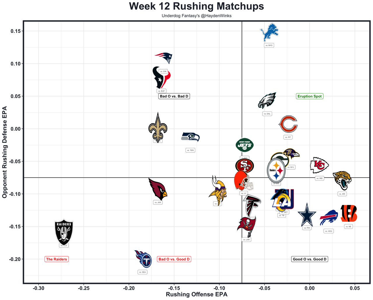 The Eagles are 8th in projected points (25.5) against a much-improved run defense with DT Quinnen Williams in the fold. On top of that, Barkley will not have Hall of Fame RT Lane Johnson (foot) for the rest of the regular season. The Eagles' success rate drops to 42% without Johnson on the field over the past 4 years. That's close to 50% with him. In terms of EPA per play, it's +0.13 with him versus -0.10 without him. It cannot be overstated how important this is. Barkley is already not getting the clean lanes he did with a healthy OL last year, and it's unclear if C Cam Jurgens can't suit up again. He's the RB10 on RB10 usage this month.