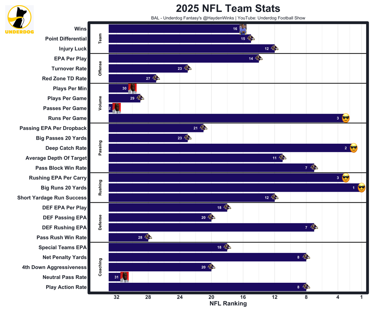• RB: J.K. Dobbins is a free agent, and 2025 2nd-rounder RJ Harvey was very inconsistent reading his blocks and in pass protection. Harvey needs some development and didn't earn guaranteed bellcow status with his play as a rookie. An early-down option to complement his explosiveness would be wise. Tyler Badie is around for pass protection as a distant RB3.