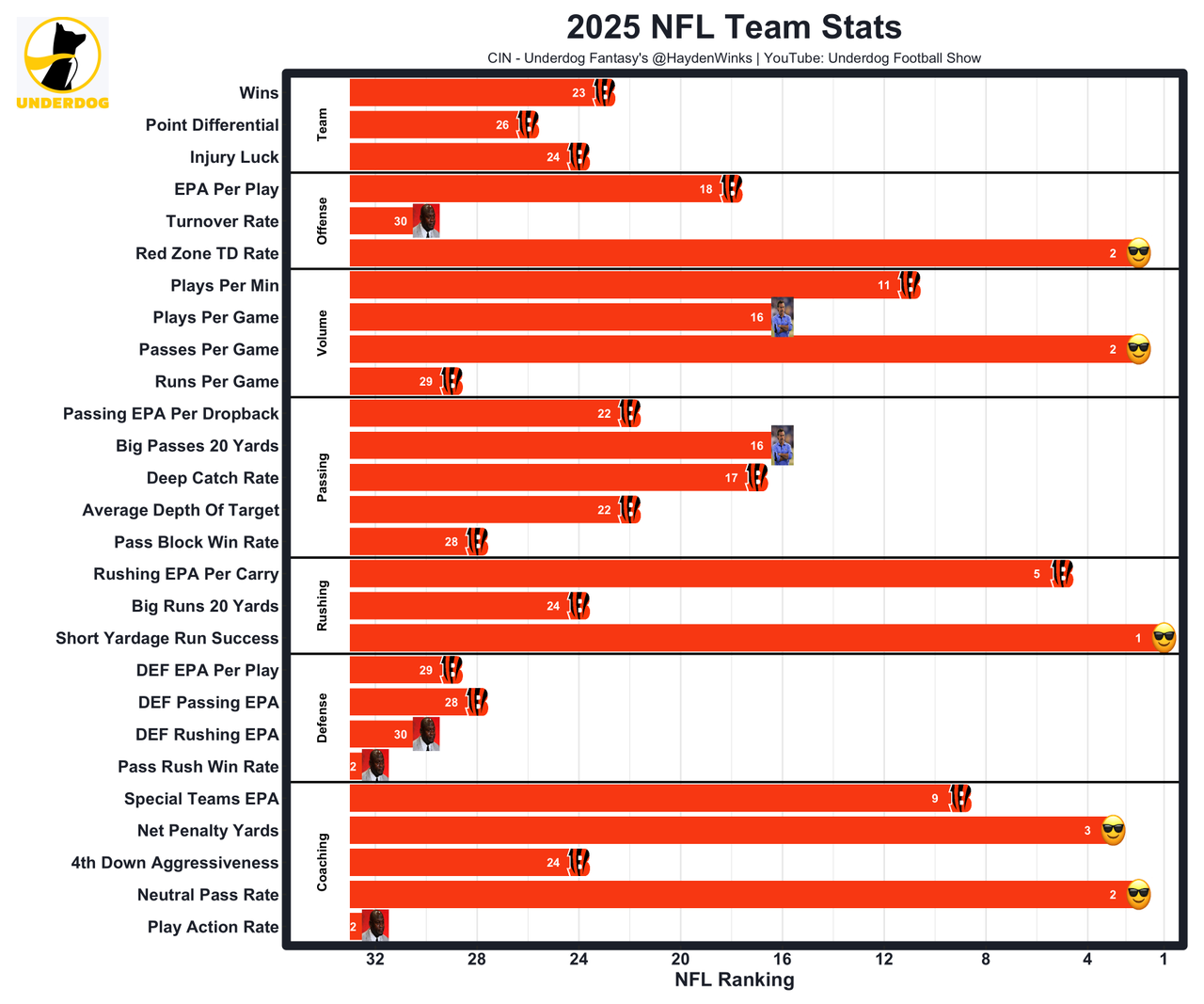 • DT: The Bengals were 32nd in Pass Rush Win Rate. That falls on their edge rushing group, too, but they get nothing from their interior players. They were also 30th in rushing EPA allowed.