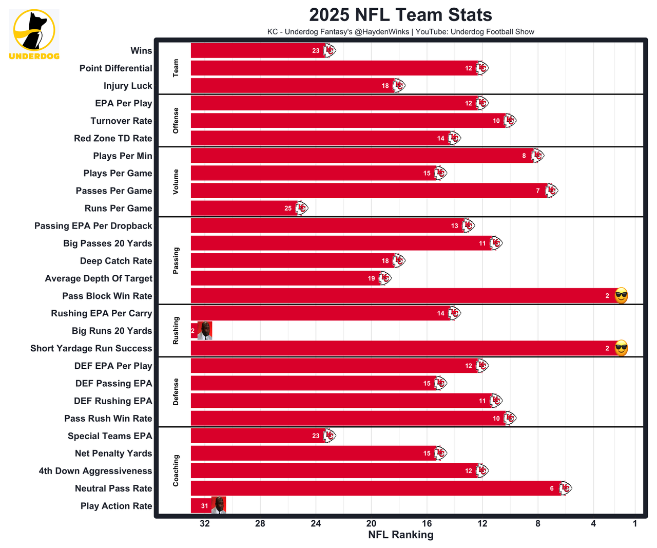 • RB: Once again, 32nd in 20+ yard runs this year. And that's behind an objectively good run-blocking line. Both Kareem Hunt and Isiah Pacheco are free agents. It's time to get real here.