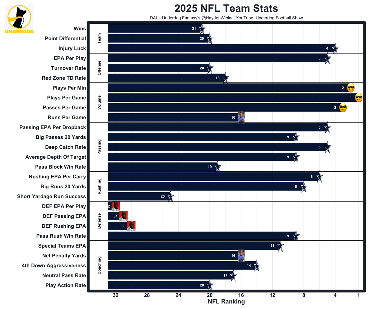 • Outside CB: Trevon Diggs was released, and they haven't settled on a running mate for the volatile DaRon Bland. The Cowboys were 32nd in EPA allowed last year on the backs of the No. 31 passing EPA secondary.