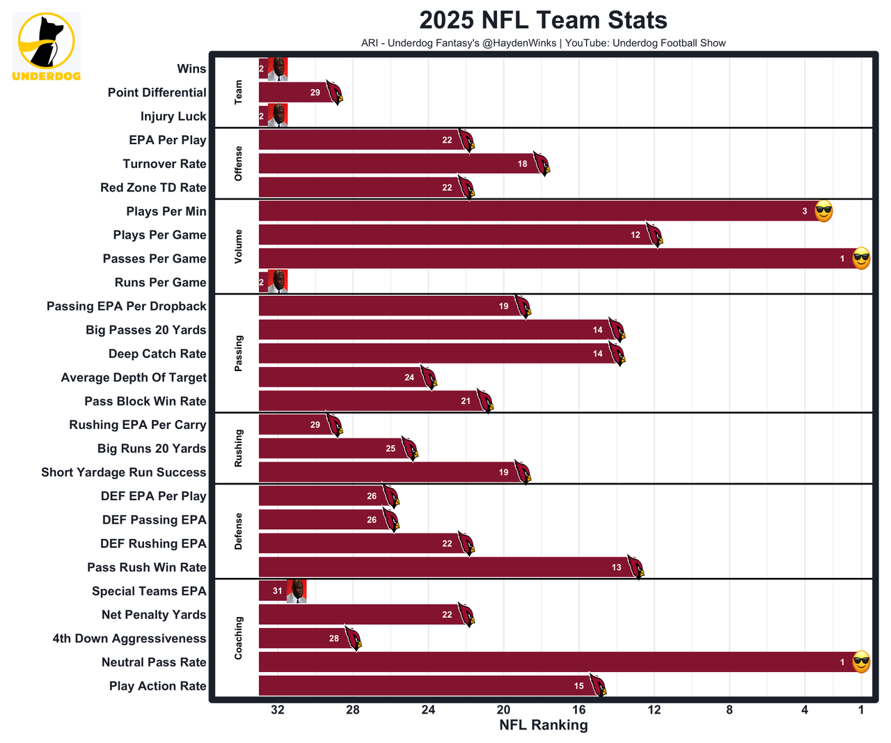 • RB: James Conner is a 31-year-old cut candidate, and Trey Benson was hurt just when they needed him last year. Overall, the Cardinals were 29th in rushing EPA per carry. Not good enough.