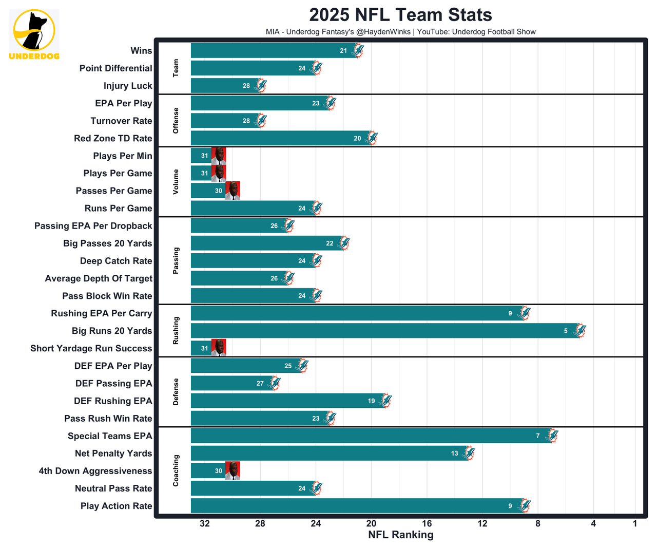 • QB: Tua Tagovailoa had the perfect setup for his play style, and it wasn't enough with his body breaking down. The new regime will weigh releasing him with $99M in dead money, but even if they don't, more competition is needed. The long-term answer isn't on the roster.
