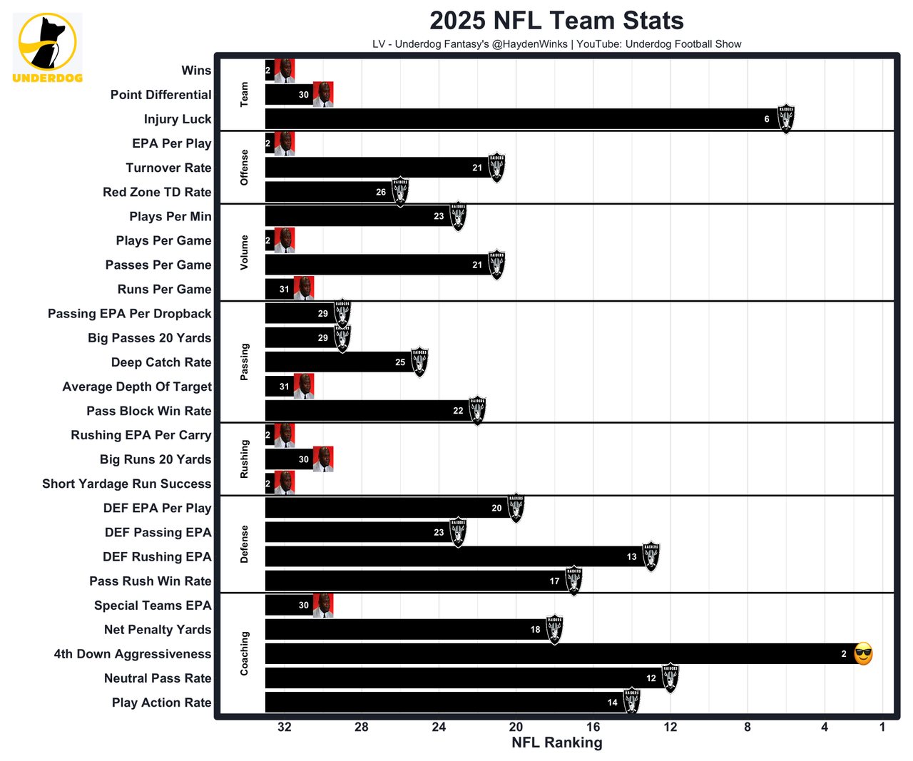 • LG: Dylan Parham is a free agent. The Raiders were 32nd in short-yardage success rate and 32nd in rushing EPA per carry. Ashton Jeanty was constantly hit behind the line of scrimmage, thus wasting a top-10 pick in the draft unless this gets changed.
