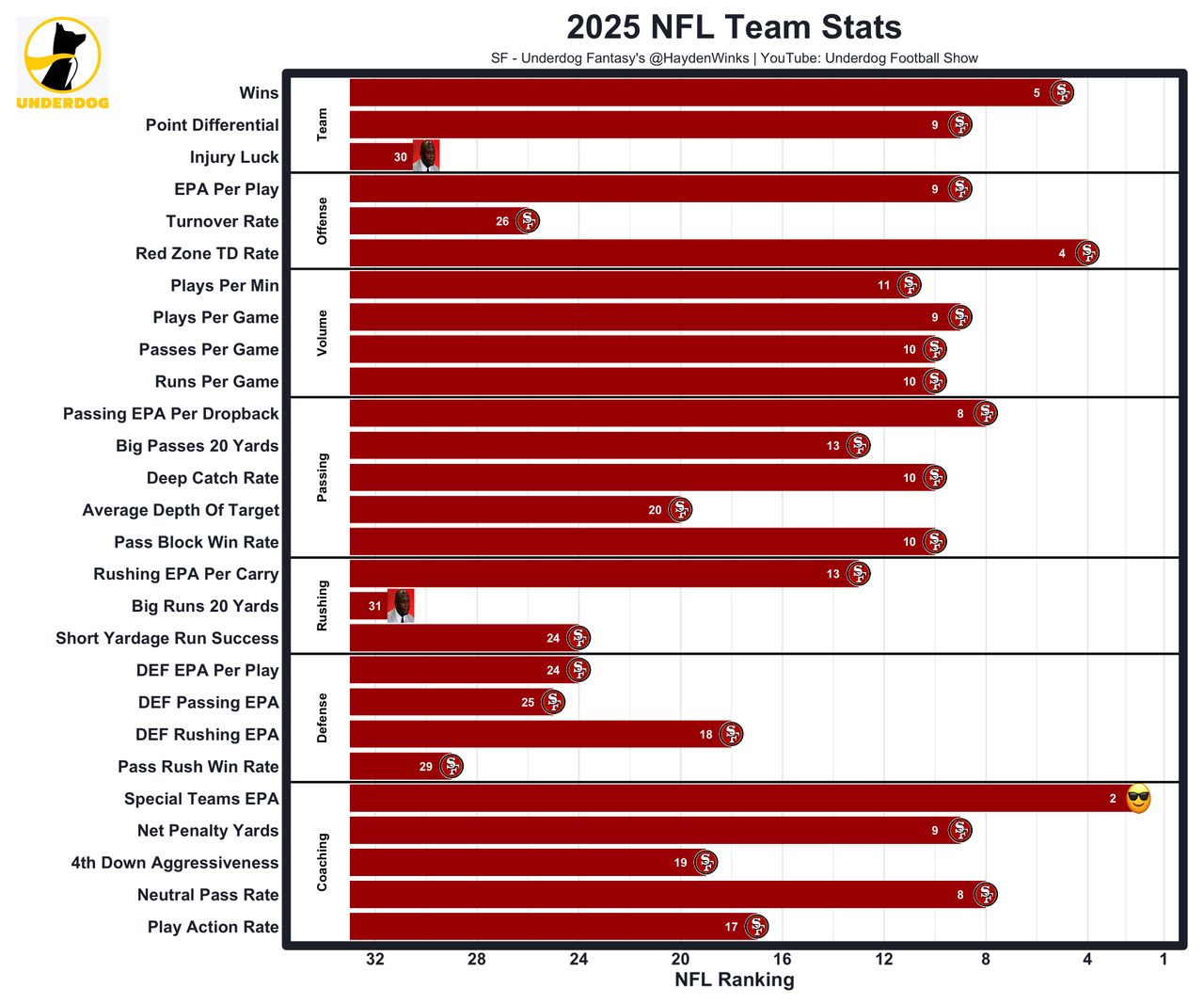 • DT: Just nowhere near good enough, and it's a position the Niners have historically tripled-down on. This was mostly an edge-rusher injury stat, but the 49ers were 29th in ESPN's Pass Rush Win Rate.