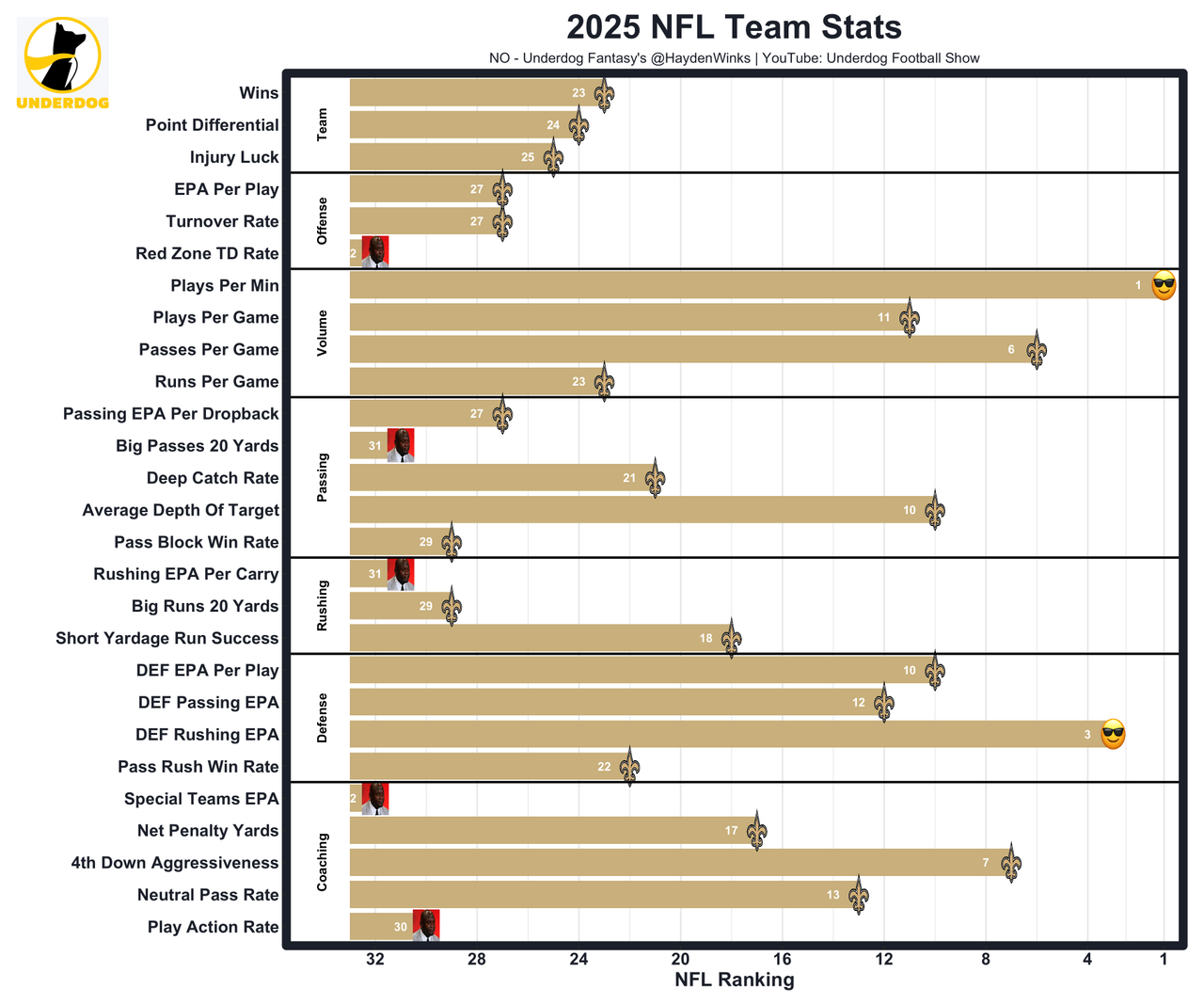 • RB: Alvin Kamara bottomed out last year and missed time again. It's amazing that he has a $18M cap hit right now. The Saints were 31st in rushing EPA per carry last year.