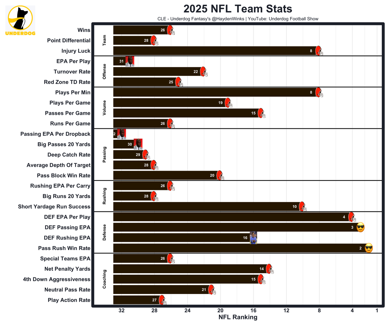 • QB: Deshaun Watson's contract remains immovable, and last year's rookies, Shedeur Sanders and Dillon Gabriel, are also under contract. Most team's have 3 quarterbacks, and the Browns technically have them. Are any good? Of course, not. This just might not be the year to solve the problem. Good luck, Todd Monken. The Browns were 32nd in EPA per dropback.
